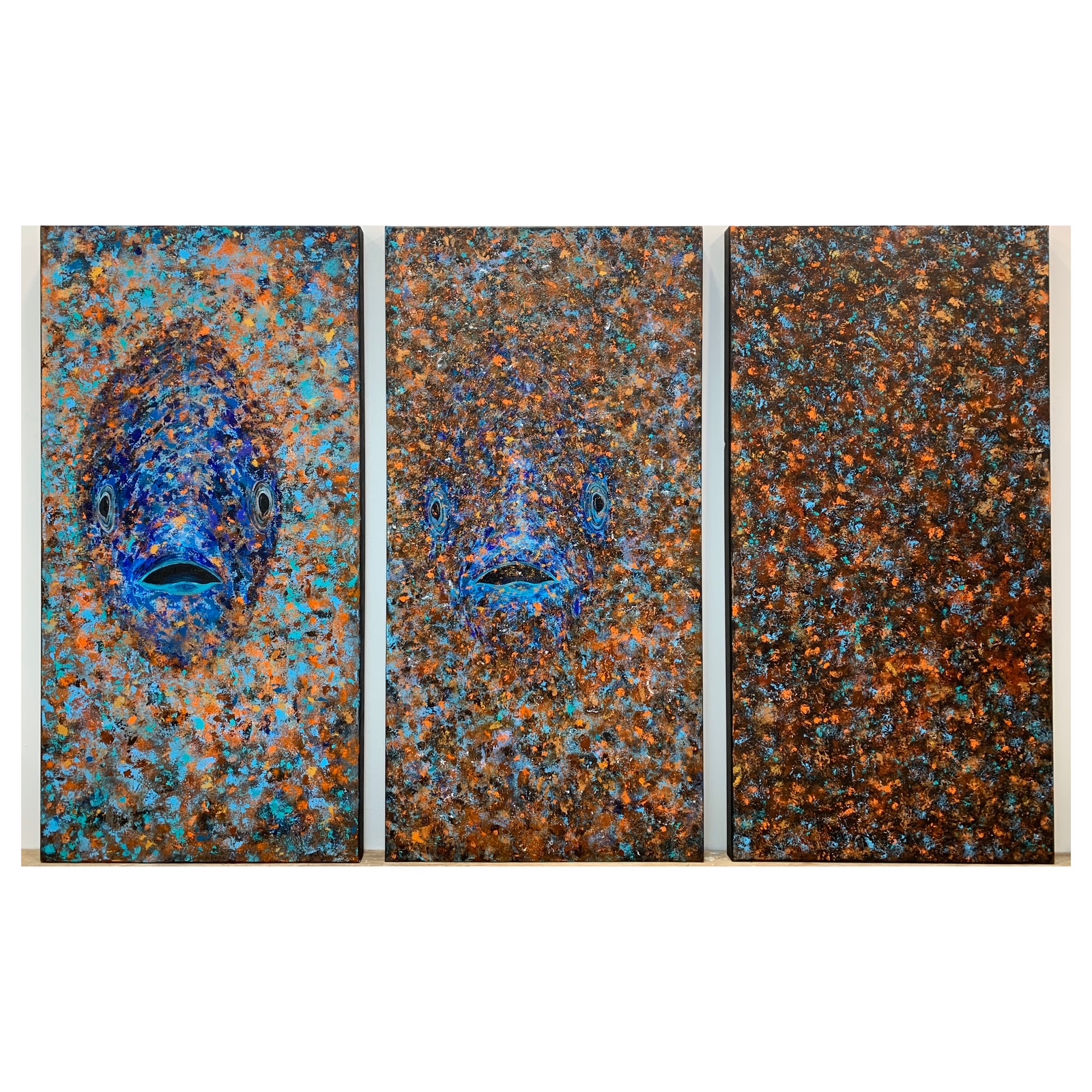 « Global warming » représente les effets du changement climatique sur les écosystèmes coralliens : blanchissement des coraux et montée du niveau des océans. Ce triptyque a été délibérément dépouillé de toute présence animale à l'exception des coraux en train de périr, mettant ainsi en avant le possible destin de nos récifs coralliens. Les coraux dépigmentés émergent en relief, se détachant de la toile pour exprimer leur révolte. Le blanc lumineux et dominant de ce triptyque alerte sur le blanchissement des coraux. Seule l'énergie de l'océan à travers le bleu du niveau de la mer et des vagues vient casser ce désert blanc par la montée des eaux. Une manière de souligner à travers l'art la vulnérabilité de nos océans.